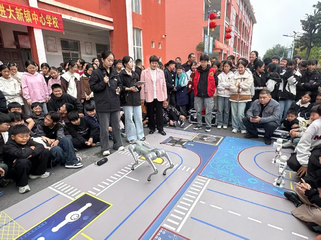 活動現(xiàn)場,縣科技館帶來的智能機器狗與機器人率先登場,瞬間成為全場焦點。隨著工作人員指令,機器狗首先開始自我介紹,隨后完成跳舞、后空翻等一系列靈活動作,與學生們握手互動環(huán)節(jié)更是引得學生驚嘆不已,掌聲與歡呼聲此起彼伏。這個環(huán)節(jié)不僅讓學生感受到了科技的神奇魅力,也激發(fā)了他們對人工智能領域的濃厚興趣。