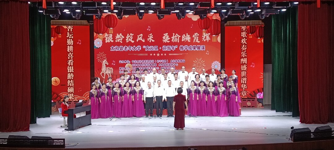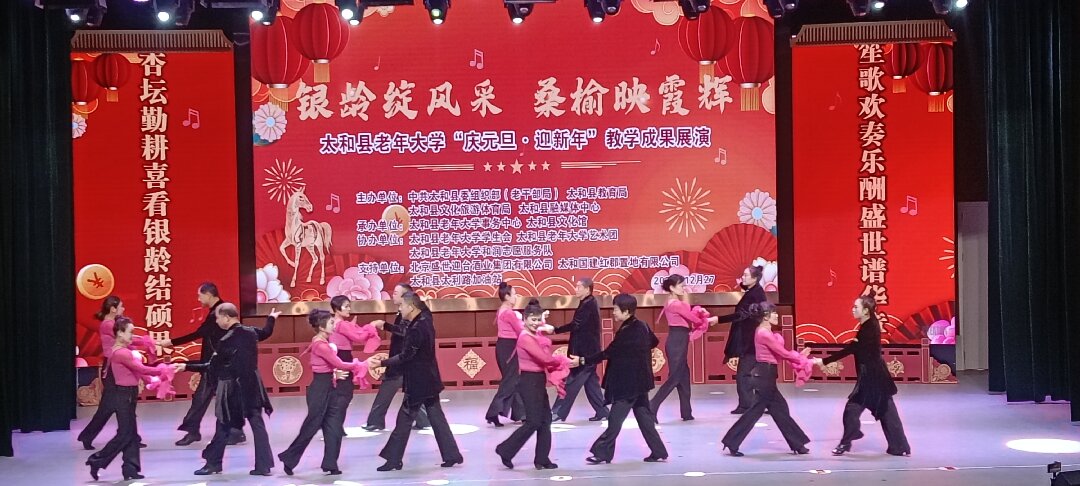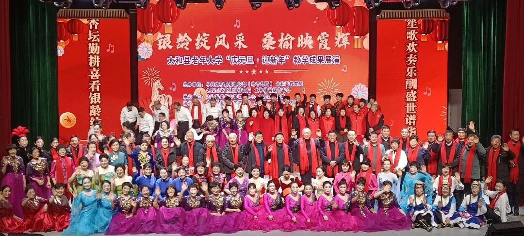 校長(zhǎng)陸鳳杰發(fā)來(lái)賀電:“銀齡綻風(fēng).桑榆映霞輝”一一太和縣老年大學(xué)2025年“慶元旦.迎新年教學(xué)成果展演”,在大家的共同努力下,取得園滿成功!各位老師棈心施教,耐心指導(dǎo),傾注了心血和汗水,辛勤付出,無(wú)私奉獻(xiàn);全體參演人員不畏寒冷,克服困難,始終以飽滿的精神風(fēng)貌,積極樂(lè)觀的態(tài)度,全心投入演出;全體志愿者和后勤保障人員以高度負(fù)責(zé)的精神為展演做好安全服務(wù),創(chuàng)造良好的演出環(huán)境。為廣大學(xué)員和觀眾奉獻(xiàn)了一臺(tái)高水平的藝術(shù)盛宴!此次教學(xué)成果展演,全體師生向縣委縣政府、向?qū)W校、向社會(huì)交出了一份滿意的答卷。得到了各級(jí)領(lǐng)導(dǎo)和社會(huì)各屆的一致好評(píng),你們用實(shí)際行動(dòng),積極踐行“老有所學(xué)、老有所樂(lè)、老有所為的辦學(xué)要求,為老年大學(xué)贏得了榮譽(yù)。在此,我代表全校師生向你們表示最衷心的感謝和崇高的敬意!