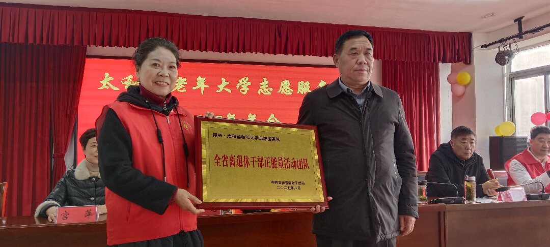 會上,朱瑞華為太和縣老年大學(xué)志愿服務(wù)隊授予“安徽省離退休干部正能量活動團(tuán)隊”牌匾。
