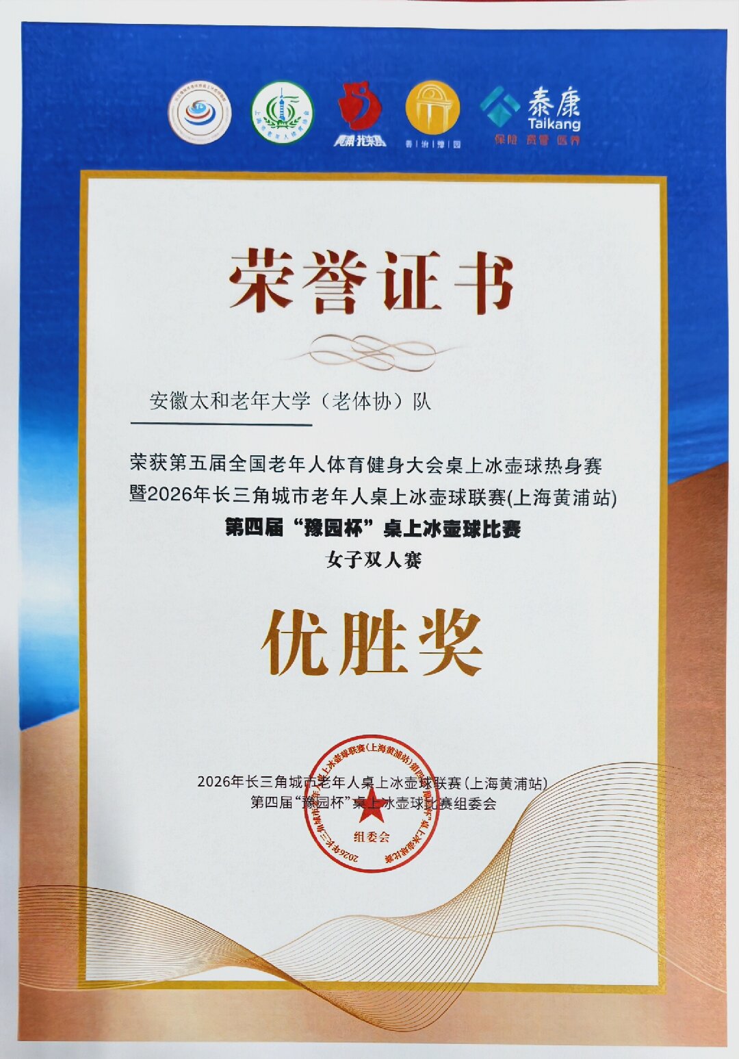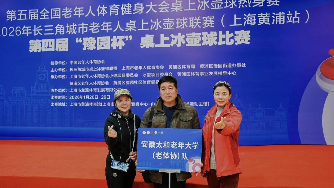 為期兩天的“第五屆全國老年人體育健身大會桌上冰壺(上海黃埔站)比賽”于2026年元月29日在上海黃埔體育場落下帷幕,安徽太和老年大學代表隊憑著穩(wěn)定的發(fā)揮,力克群雄,最終取得第五名的好成績。