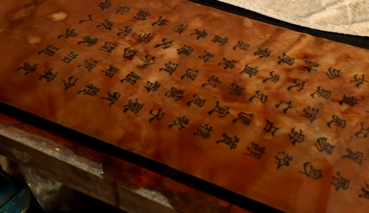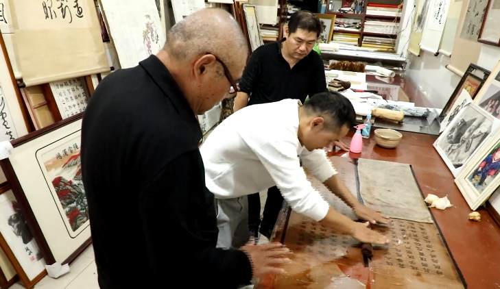 看人家客戶拿來的東西爛到了什么程度,一伸開一看心里就有數(shù)了,得使什么方法把這個(gè)活來完成,這個(gè)畫給人家成全好,這個(gè)畫呢有用水泡的,有干泡的也有在案子上泡的。